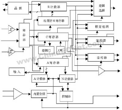 同时为了保证R计数器和A计数器以及N计数器同时工作,MC145201设计了特殊的双缓存的R寄存器。原理如下:当16比特数据来的时候,首先被R寄存器的第一个缓存器写入,当A寄存器开始工作时,R寄存器的第2个缓存器读入第一个缓存器的低13位(也就是R计数器所需的),这样就保证了R、A和N计数器的同时工作。